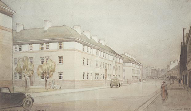 Mears was a pioneer of conservation in Scotland’s historic burghs. In Edinburgh, he campaigned for the renewal of the Royal Mile and undertook the restoration of Huntly House and Gladstone’s Land. In the period between 1936 and his death in 1953, he acted as planning consultant to the burghs of Dumfries, Elgin, Girvan, Greenock, Perth, Stirling and Thurso. Perhaps the best example of his reconstruction work in historic burghs is his scheme for the renewal of Stirling’s Old Town.