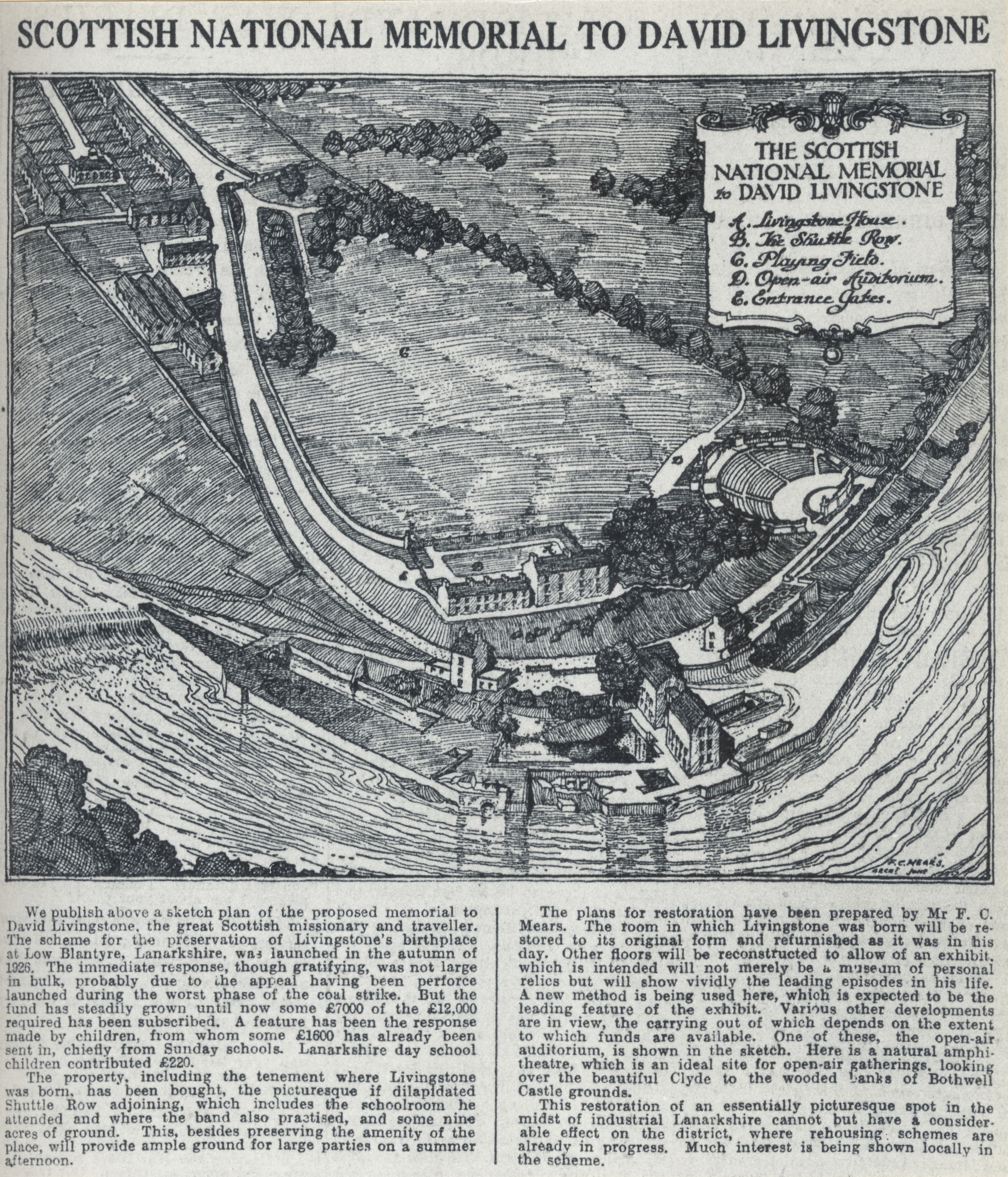 There were three remaining buildings on the site: a three-storey tenement of 24 single-ends, one of which was Livingstone’s birthplace; an adjoining row of two-storey cottages, and a lodge in its own grounds. An option over the properties was secured from Messrs. Baird & Co., the local coal mining company, and a temporary Memorial Committee was established. In order to promote the scheme, the Committee recruited the support of an impressive array of Scottish dignitaries, including J. M. Barrie, John Buchan, Ramsay Macdonald, the Duke of Hamilton, Field Marshal Lord Haig, the Earls of Elgin and Home, the leaders of the Scottish churches, the principals of the Scottish universities and the provosts of the cities and principal towns. An appeal was launched in 1926 but, in the uncertain climate created by the National Strike, wealthy benefactors were reluctant to come forward. It was not until the following year, after an approach had been made to Scottish Sunday schools and bible classes, that sufficient funds were raised to allow the project to proceed.